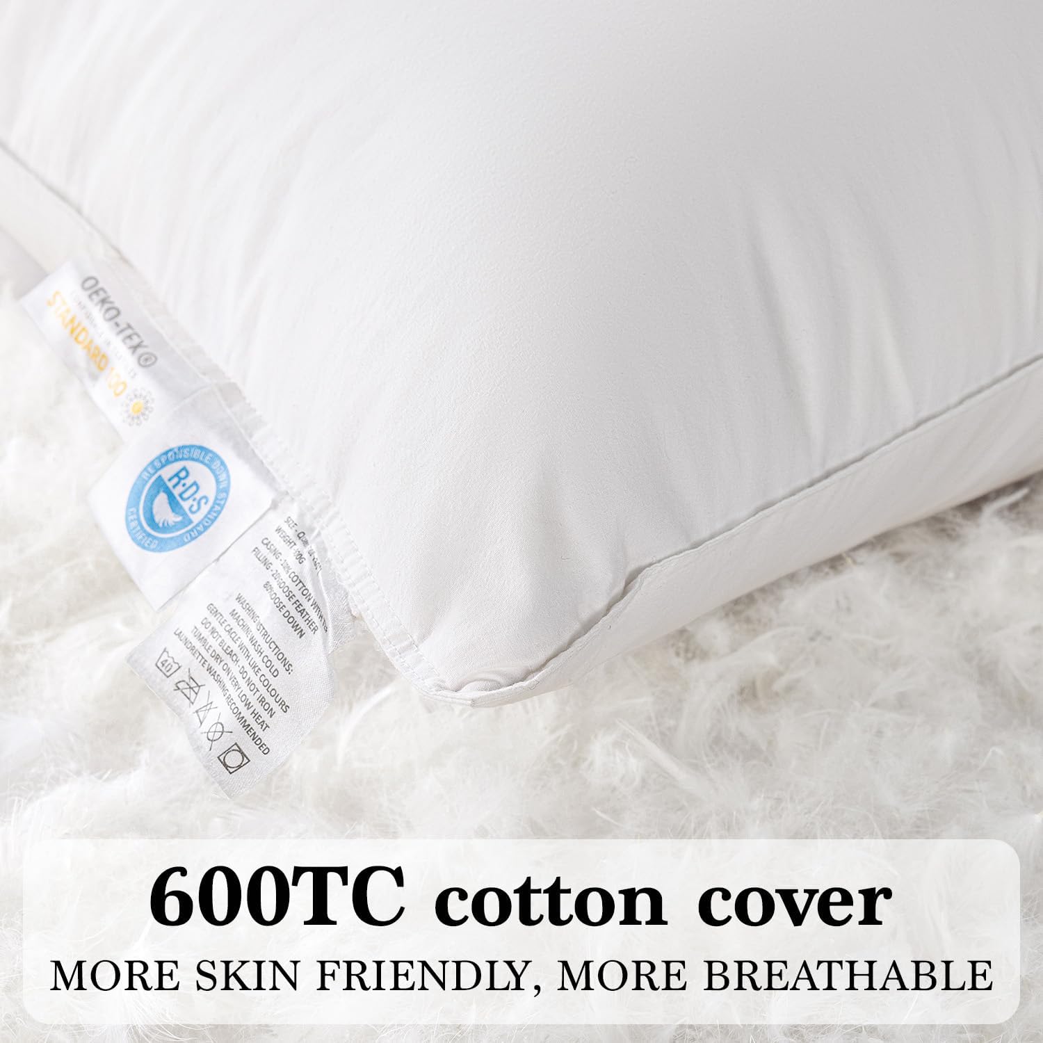 The combination of natural down fill and a 100% cotton shell creates a naturally breathable pillow. Down clusters allow air to circulate through the fill, while the cotton cover wicks moisture rather than trapping heat against the skin.